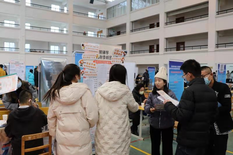 在培黎校区体育馆举办的招聘会现场,毕业生们与用人单位积极交流,递交个人简历,部分企业还进行了简单的面试。电子信息工程学院、美术设计学院、音乐学院等二级学院组织毕业生参会,并为毕业生进行现场求职指导。本次招聘会共邀请到浙江南开电气有限公司、晶科能源有限公司、陕西猿起信息科技有限公司、甘肃建投隧道工程有限公司等各类用人单位72家,提供就业岗位6178个,收到简历703份,初步达成意向473人,现场签约31人。
