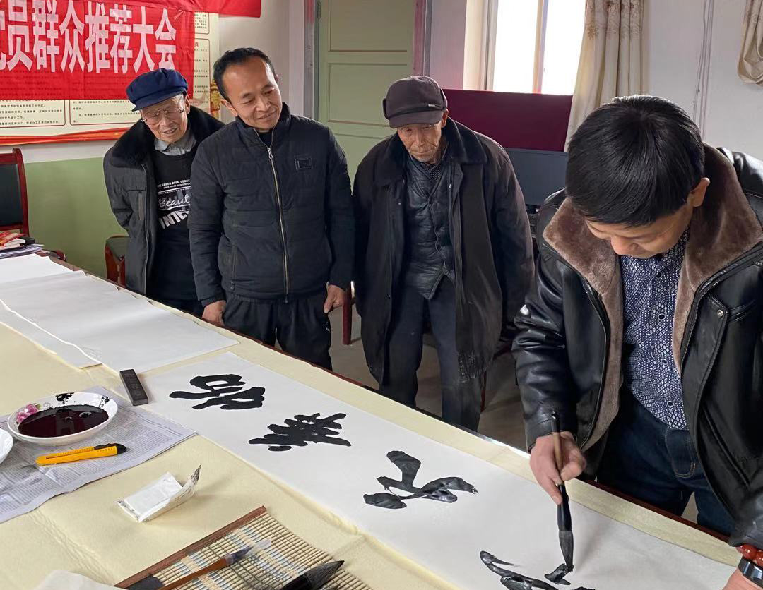 学校教职工书法协会成员白奉源、杨永发、米文佐三位书法家依次在马峡村、贠王村按需为村民们书写赠送了书法作品。十二月的郭嘉镇已有淡淡的年味,随着文化扶贫工作队的到来,天空飘下悠闲的雪花,在工作队浓郁的文化春风中,秦安群众的热情被点燃,对艺术的强烈需求获得了一定程度的满足。边写边讲解,群众的欣赏水平在潜移默化中得到了提高。